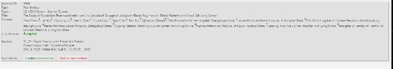 世界肺癌大會(huì)(WCLC)是世界上最大的致力于肺癌和其他胸部惡性腫瘤的會(huì)議,有來自100多個(gè)國家的超過7,000名與會(huì)者代表,共同討論胸部惡性腫瘤研究的最新進(jìn)展。2017年世界肺癌大會(huì)將于10月15日在日本橫濱召開,屆時(shí)程穎院長(zhǎng)會(huì)在壁報(bào)現(xiàn)場(chǎng)向世界各國與會(huì)專家介紹洛鉑研究結(jié)果。