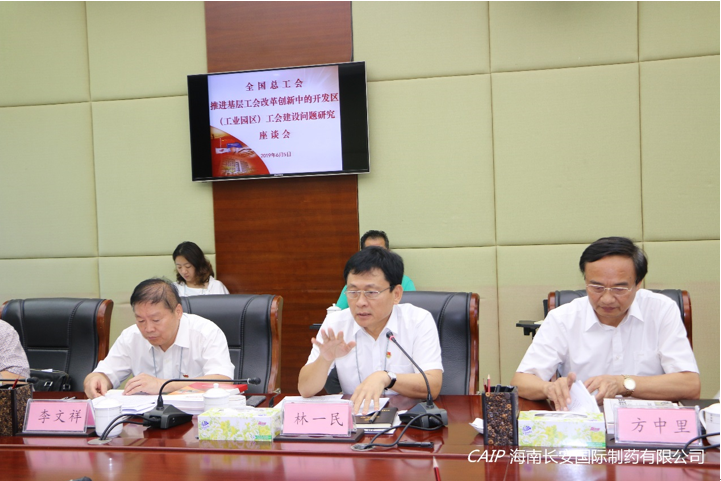 6月5日,全國總工會(huì)副主席、書記處書記蔡振華一行5人到海口國家高新區(qū)就“推進(jìn)基層工會(huì)改革創(chuàng)新中的開發(fā)區(qū)(工業(yè)園區(qū))工會(huì)建設(shè)問題研究”主題開展專題調(diào)研。省總工會(huì)黨組書記、常務(wù)副主席王全,市人大常委會(huì)黨組副書記、副主任,市總工會(huì)黨組書記、主席方中里,高新區(qū)管委會(huì)主任林一民等陪同。在高新區(qū)工會(huì)的推薦下,海南長安國際制藥有限公司作為企業(yè)代表出席本次調(diào)研會(huì)議。